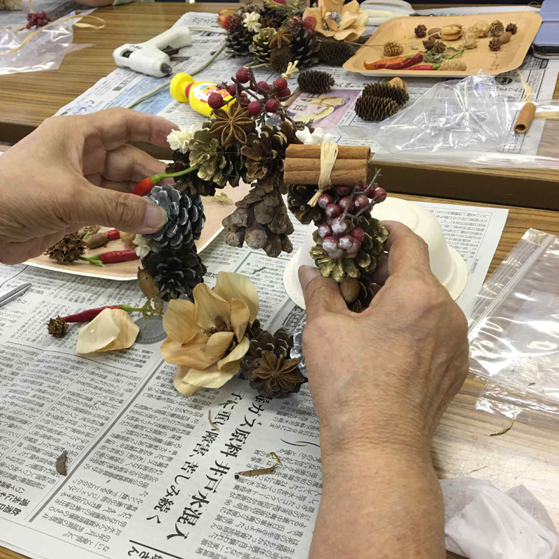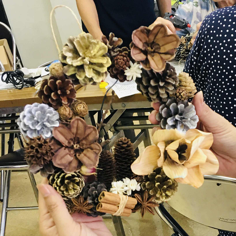 今月は9月9日(火)に25名の方にご参加いただき、経木のお花をあしらった森のリースを作りました。