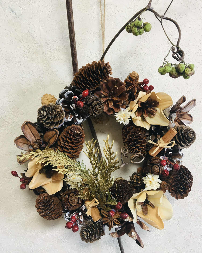 最後に、木の実やドライフラワー、ブドウのツルなど森の素材をたくさん飾って、リースを仕上げました。