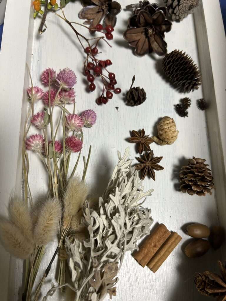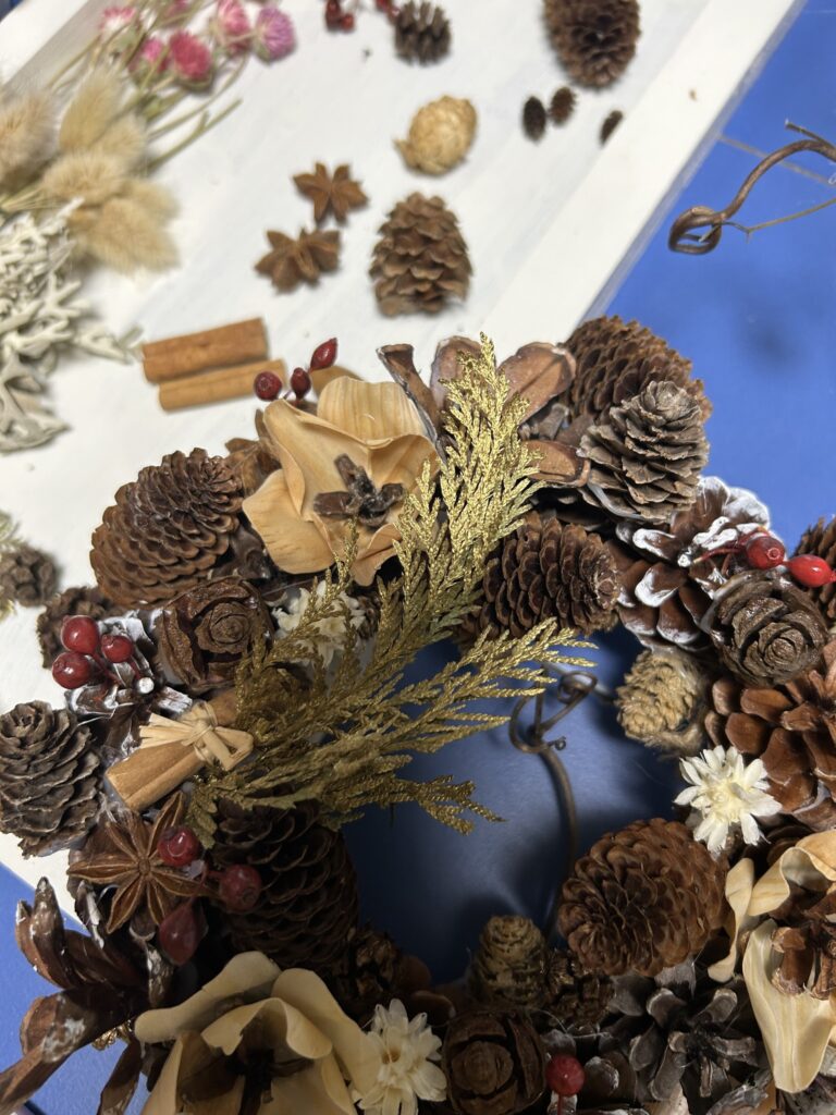 たくさんの木の実や経木のお花で、賑やかに松ぼっくりのリースを飾りつけましょう!