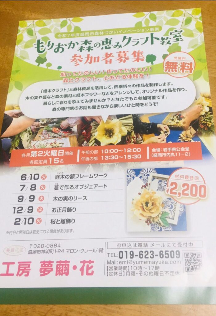 工房 夢繭*花が岩手県公会堂文化祭2025に出展いたします。松ぼっくりを連結させたリースベースに、盛岡市産材の経木の花びらを飾る、「経木フラワーのブランコリース」や、経木から透ける光が美しい「経木の飾り」をおつくりいただけます。 ワークショッ... -