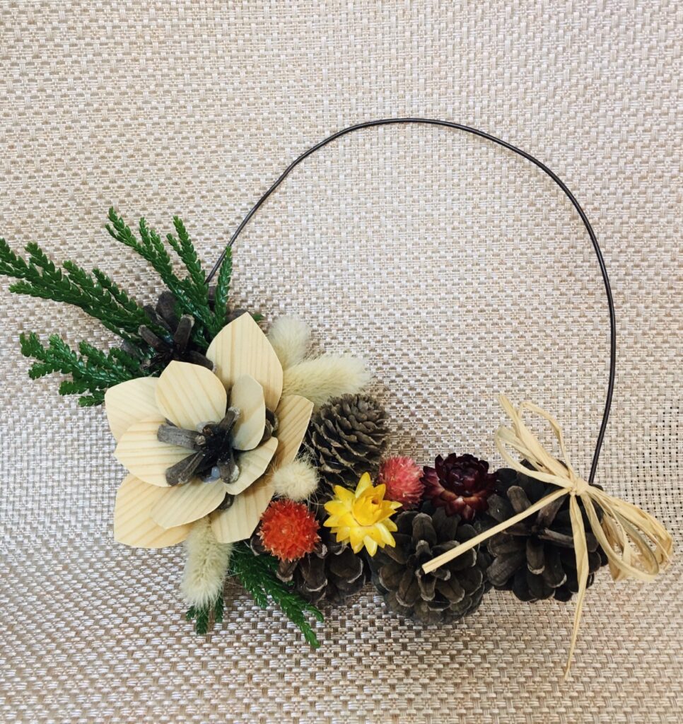 9/9「もりおか森の恵みクラフト教室」経木のお花のリースを作りました
